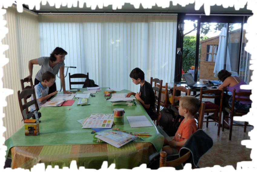|  C'est aussi aujourd'hui la rentrée scolaire. La nuit a été agitée, pas pour les enfants, mais pour la prof  C'est une sacrée responsabilité que de continuer à donner envie à nos enfants d'apprendre et de les aider durant cet apprentissage. Côté organisation, c'est le top, on a de l'espace avec une pièce de 25m2 au moins, soit près du double du camping car, il ne faudrait pas qu'on s'y habitue ....................... Chacun est super motivé, même si on doit s'habituer aux manuels et surtout se convaincre que les vacances sont finies. On veut mettre les bouchées doubles jusqu'à notre départ pour n'emmener que certaines matières (français, maths, HG, anglais et latin pour Sara) et terminer les autres (dessin, musique, SVT, éducation civique) avant de partir. C'est un véritable challenge, car nous n'avons pas encore reçu tous les cours, ni accès à tous les fichiers audio sur internet......... bref, ça va être chaud