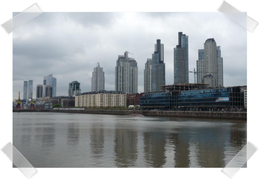 |  10 octobre 2011 |  | Aujourd'hui, c'est un jour férié en Argentine; Enfin pas tout à fait, puisque la date de la fête nationale est le 12 octobre, mais comme les Argentins voulaient un we prolongé , ils ont décrété que cette année le 12 octobre devait être un lundi, donc le 10 octobre  Du coup, nous ne pouvons pas récupérer notre cc aujourd'hui  Alors, une fois de plus nous avons le temps de parcourir la ville. Cette fois, ce sera "Puerto Madero", un quartier plus récent et moderne près du port. Oubliés les vieilles architectures et place aux buildings en verre  Les habitants de BA y passent les we car ils y a de nombreux espaces verts, une réserve écologique (construite sur une décharge) où les joggeurs règnent en maîtres. | |