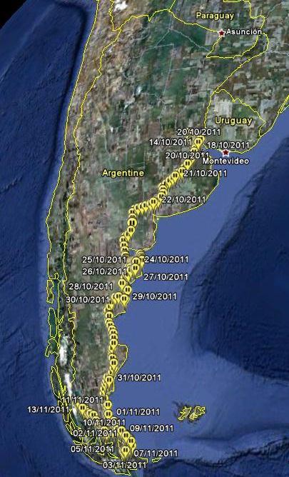 13/11/2011 34 jours de route 5820 kms parcourus Lieu Actuel: Torres del Paine (Chili) | |